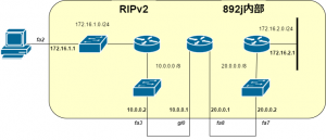 アドレス集約が行われているため、172.16.1.0/24 と 172.16.2.0/24 が 172.16.0.0/16 にまとめられていた。この問題はRIP version2にすることでサブネットの情報まで通知できるようになり、解決する。