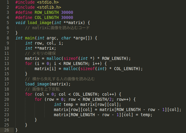 と参照しているため、row=0の配列とrow=n-1の配列の参照を、row=1の配列とrow=n-2の配列を...と入れ替えるだけで簡単に上下反転することができました。
