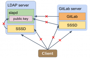 それぞれにSSSDがインストールされており、sss_ssh_authorizedkeys コマンドを用いてLDAPに登録されている公開鍵でログインできるようになっているはずが、SSHログインできなくなっている状態がスタートです。