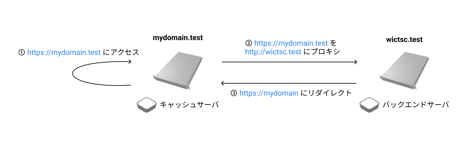 https://mydomain.testにアクセスcache サーバがhttp://wictsc.testにプロキシ- バックエンド側(SaaS) が設定済みのカスタムドメイン(