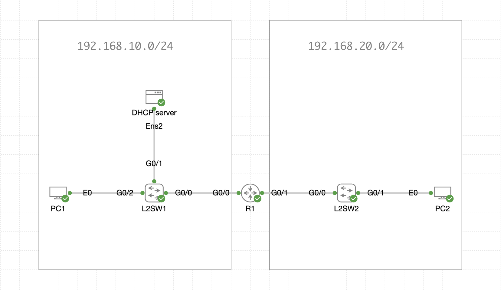 下記のネットワークトポロジー図では、PC1(192.168.10.0/24 セグメント)には DHCP サーバから正常に IP アドレスが割り当てられている。 一方、PC2(192.168.20.0/24 セグメント)には DHCP サーバから IP アドレスが割り当てられていない。
