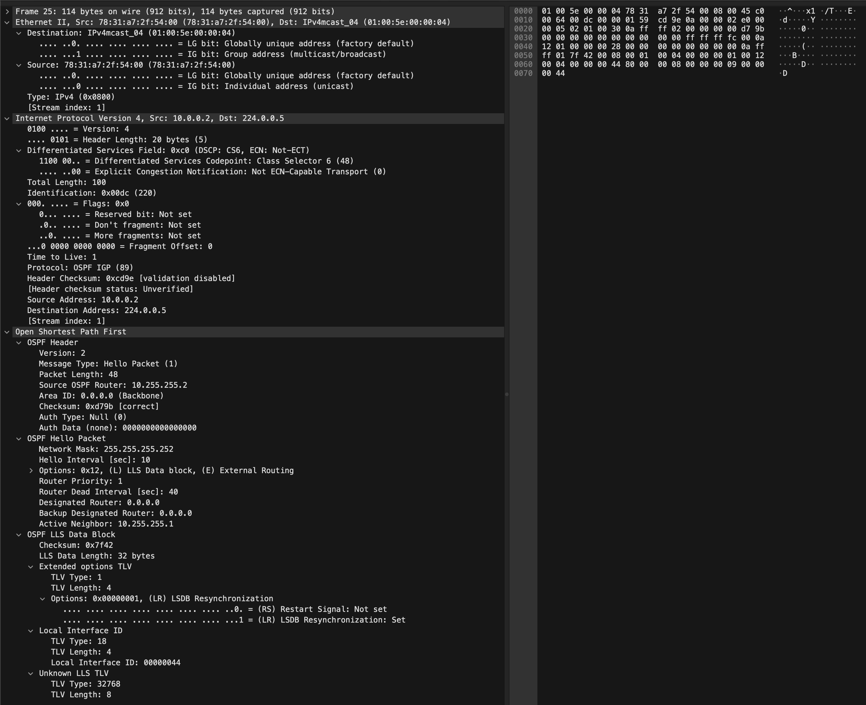 R1 - R2 間のリンクにて OSPF hello packet をキャプチャした。添付のパケットキャプチャは一部編集されたものである。編集された項目として最も適当なものを1つ選べ。
