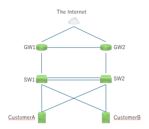 その結果 vlan 100 を利用している CustomerA は GW1,GW2 への到達性を失うこととなる。