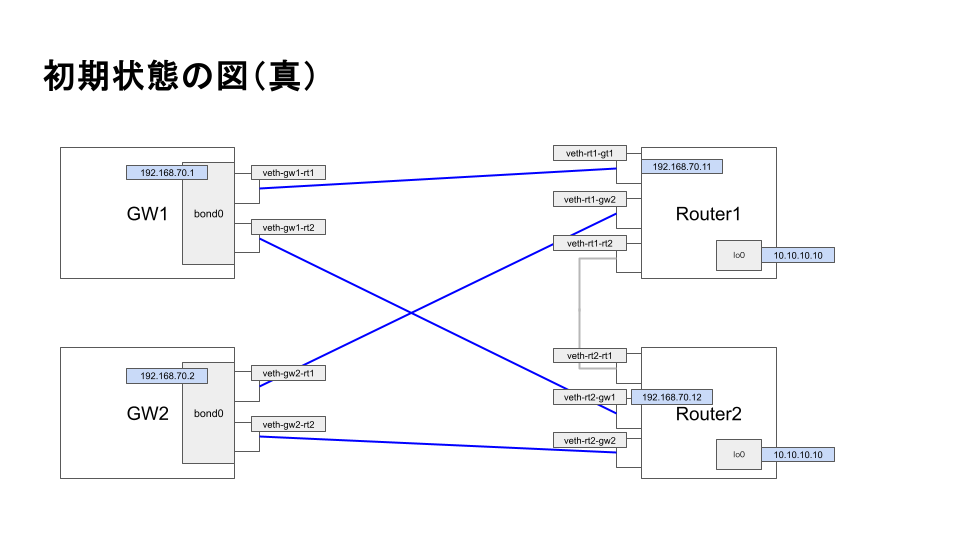 GW側ではbondingを削除し、各vethインターフェイス(veth-gw1-rt1, veth-gw1-rt2等)に直接同じIPアドレスを割り当て、**ECMP(Equal-Cost Multi-Path)**ルーティングで2つのnexthopを設定します(ip route add 10.10.10.10/32 nexthop via ... dev ... nexthop via ... dev ...)。これにより、Linuxカーネルのマルチパスルーティング機能を使って負荷分散と冗長性を実現します。